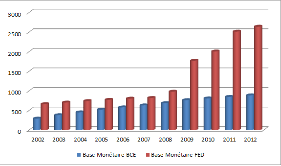 Figure 1 : Évolution de la base monétaire, milliards d’euros et dollars (Sources: BCE, St. Louis Fed, 2013)