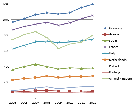 在2009年至2012年,只有包括希腊、葡萄牙等少数国家名义支出有所下降。这两个国家2012年比2007年的支出多。