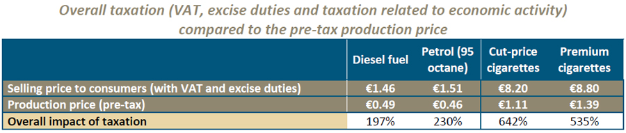 Together, all these forms of taxation and legal obligations related to fuel may amount to 197% to 230% of the pre-tax production price. As regards cigarettes, they may amount to between 535% and 642%.