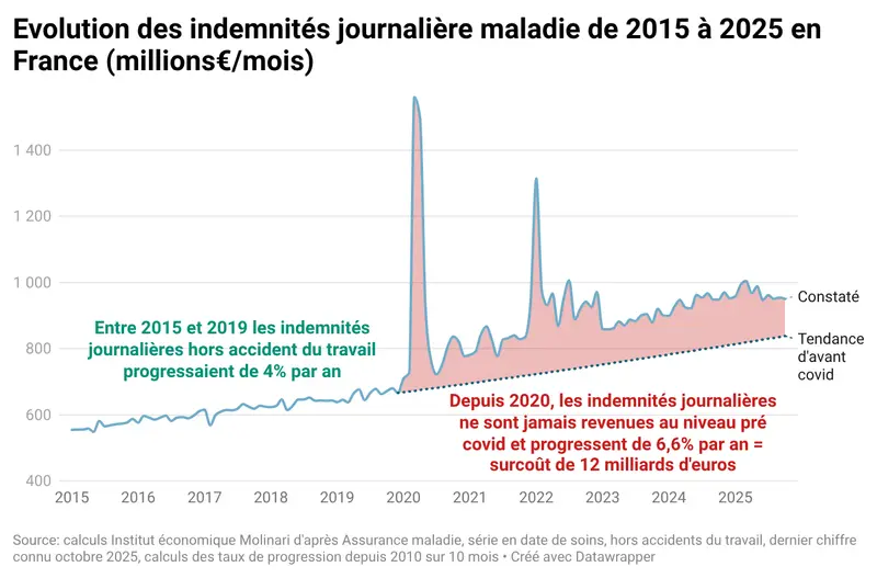 Depuis 2020, les indemnités journalières ne sont jamais revenues au niveau pré-pandémie et progressent de 6,6 % par an au lieu de 4 % entre 2015 et 2019. Interview avec Jérôme Larché, médecin interniste, Conseiller médical Covid long, ARS OCCITANIE, et Cécile Philippe, présidente de l’Institut économique Molinari, publiée dans Atlantico.